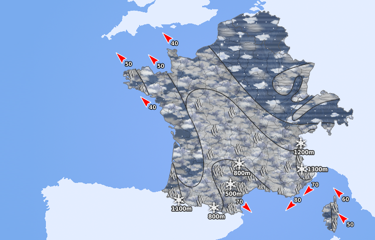 On conserve de fortes précipitations dans le sud de la France, notamment sur les régions méditerranéennes et jusqu'au sud du Limousin. Par isothermie, la neige tombe dès 500 à 900 mètres entre l'est des Pyrénées et le sud-ouest du Massif Central. Des pluies plus faibles remontent jusqu'au Centre et à la Sarthe tandis que des averses concernent la pointe bretonne et le sud de l'Aquitaine. Au nord-est, un temps sec perdure sous un voile nuageux plus ou moins épais. Les nuages bas sont souvent tenaces en plaine d'Alsace et dans les vallées du nord de la Suisse. Les températures maximales sont en baisse et se rafraîchissent.