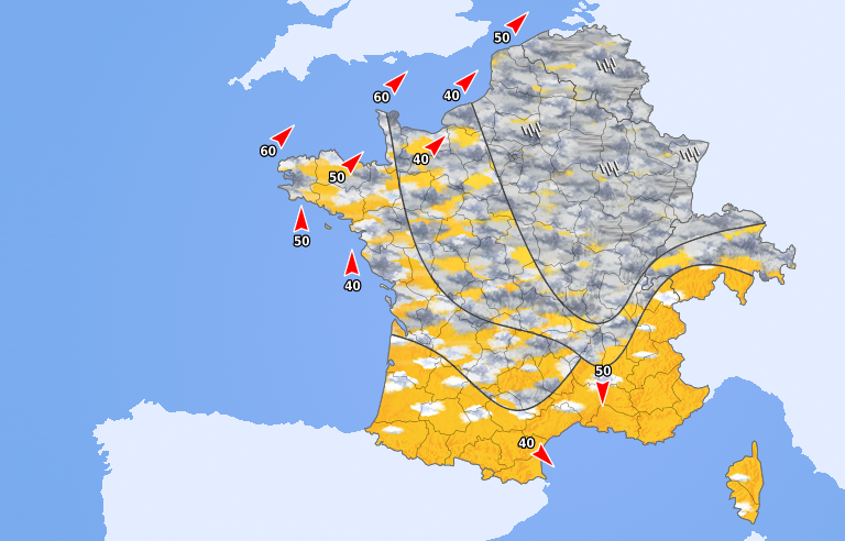 La moitié est bénéficie d'un ciel étoilé, profitant à un rapide refroidissement et à de nombreuses gelées. En revanche, le ciel est souvent couvert dans la moitié ouest avec quelques pluies intermittentes. Elles sont bien plus actives sur les départements pyrénéens avec beaucoup de neige dès 1100-1200 mètres. Mistral et tramontane restent soutenus. Par ailleurs, des averses concernent l'est de la Corse.