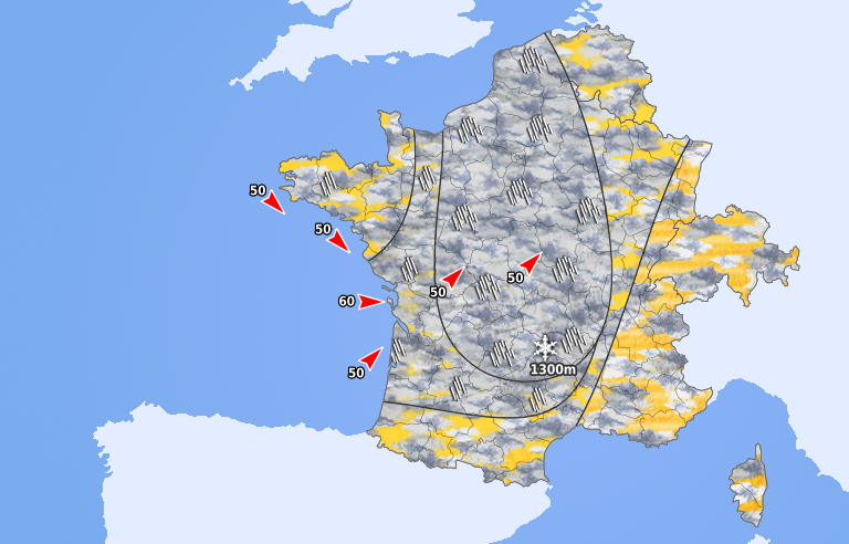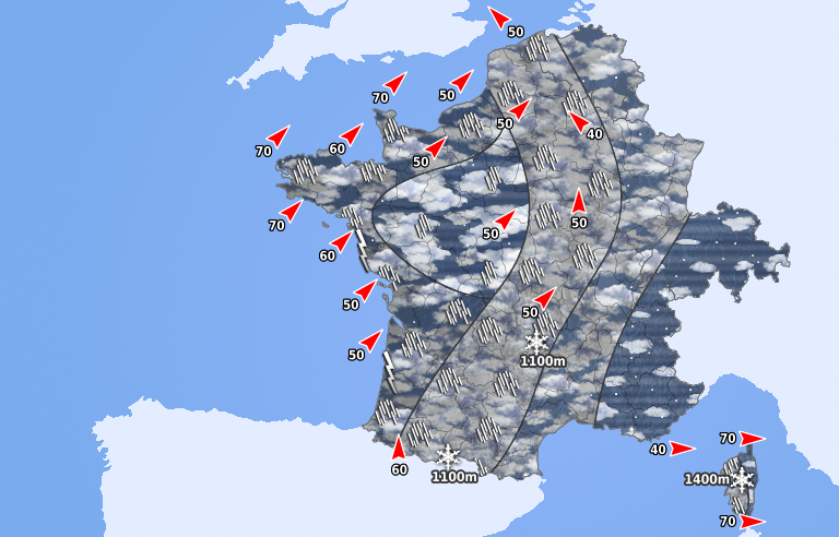 Le front pluvieux s'étire des Pyrénées aux Hauts-de-France avec de la neige dès 1100 mètres. De fortes averses suivent sur les régions bordant la Manche et l'Atlantique avec des coups de tonnerre possibles et un vent soutenu. Le temps est nettement plus calme des frontières de l'est à la Méditerranée, en dehors de quelques averses sur l'ouest de la Corse.