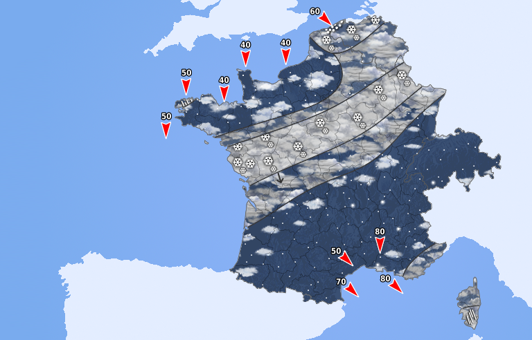 Nous passerions en flux de nord-ouest à l'arrière de la dépression de la veille. Des averses ou giboulées sont attendues du sud-ouest aux régions de l'est avec de bonnes chutes de neige pour le nord des Alpes. En Méditerranée, de puissantes rafales de vent sont prévues. En fin de journée, la pluie pourrait faire son retour par l'Atlantique. Les températures repartent à la baisse avec un froid modéré pour le nord et l'est.