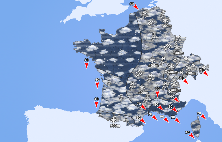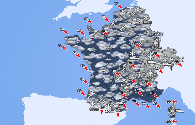 Une journée d'accalmie nous attend. Le soleil domine dans le sud tandis que le ciel est gris au nord-ouest avec quelques gouttes vers la Manche. Entre les deux, un ciel changeant est prévu du Massif Central aux frontières allemandes. Le mistral et la tramontane sont puissants avec des rafales atteignant 90 km/h. Les températures minimales sont froides avec un gel étendu et ponctuellement dommageable pour la végétation. Les valeurs diurnes conservent des niveaux bien frais.