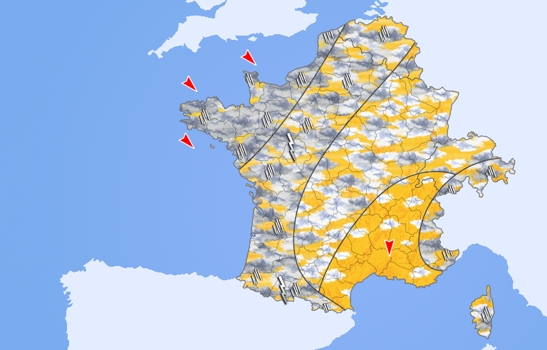 Les nuages dominent dans l'est ainsi qu'en Suisse avec encore quelques averses, plus nombreuses en Corse. En parallèle, un faible front pluvieux s'enfonce sur le nord-ouest de la France. Ailleurs, nuages et éclaircies se partagent le ciel. Le soleil le plus franc brille des Pyrénées au golfe du Lion mais il faut composer avec un mistral et une tramontane soufflant jusqu'à 80 km/h en rafales. Les températures maximales sont en hausse et se radoucissent.