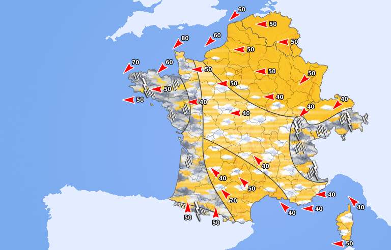 La fin de journée est dominée par le soleil malgré plus de nuages sur les régions océaniques, associées à un risque d'averses orageuses sur l'ouest de la Bretagne et l'Aquitaine. D'autres peuvent concerner les régions alpines. Le vent reste sensible sur les régions du nord et notamment en Manche.