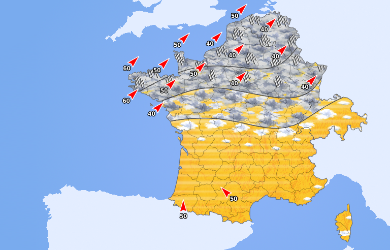 Le temps reste couvert sur la moitié nord de la France et de la Suisse avec encore des pluies faibles à modérées sous un vent de sud-ouest sensible. En revanche, les régions du sud bénéficient d'un temps sec avec de larges éclaircies.