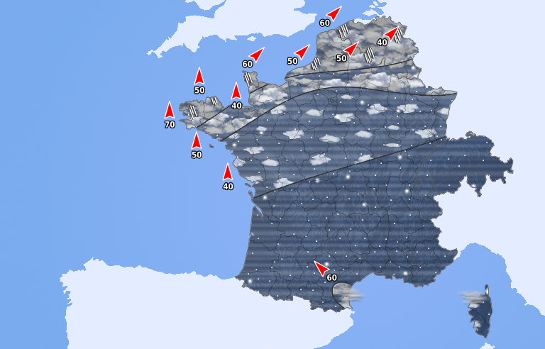 Un front faiblement pluvieux circule de l'Aquitaine à la Champagne, suivi d'un ciel variable et de quelques averses au nord-ouest. Le vent est sensible près de la Manche et de la Mer du Nord. De nombreux nuages remontent du golfe du Lion aux Cévennes. En revanche, c'est vers les frontières de l'est, la Suisse et la Corse que le soleil s'annonce le plus généreux. Les températures fléchissent légèrement mais sont toujours très douces pour un mois de décembre.