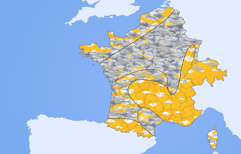 Quelques gouttes sont possibles sur la Bretagne et les côtes de la Manche et du golfe du Lion aux Cévennes. Dans les autres régions du sud et du centre, de larges éclaircies dominent tandis que la grisaille a l'avantage sur le tiers nord, jusqu'au val de Saône et dans les vallées suisses.