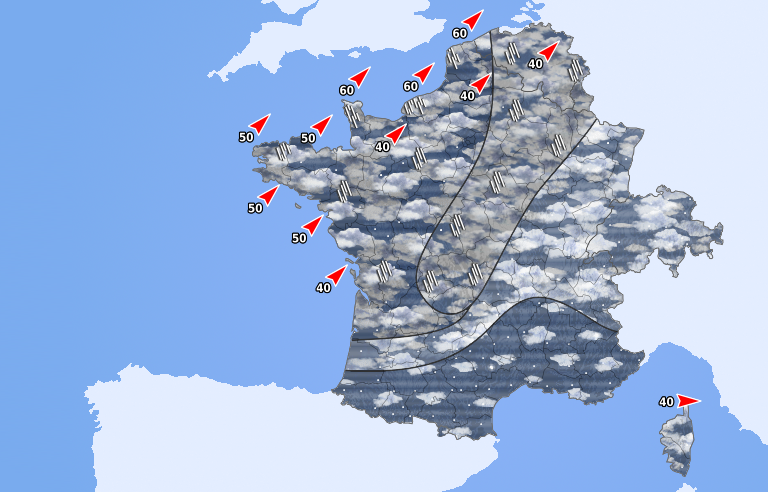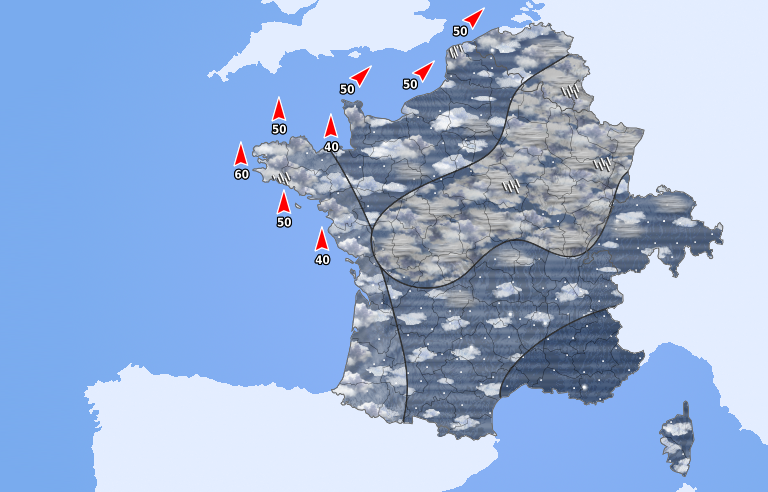 De la grisaille s'impose du Poitou au nord-est avec encore quelques bruines locales. Ailleurs, le ciel est simplement voilé, plus densément en allant vers l'océan. On ne peut exclure quelques gouttes vers la côte sud de la Bretagne et la côte d'Opale.