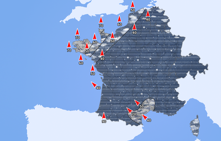 Un ciel simplement voilé concerne la majeure partie des régions. On retrouve toutefois de nombreux nuages venus de la mer du golfe du Lion vers les Cévennes, poussés par un vent de sud-est sensible. En parallèle, un front pluvieux déborde sur l'ouest de la Bretagne, accompagné d'un vent de sud soutenu.