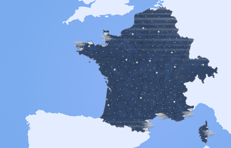 Le temps est calme avec un ciel étoilé sur la plupart des régions. Des entrées maritimes concernent certains rivages méditerranéens, notamment l'Aude, la plaine du Languedoc et la côte d'Azur. D'autres concernent la pointe bretonne et la Manche.