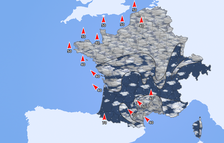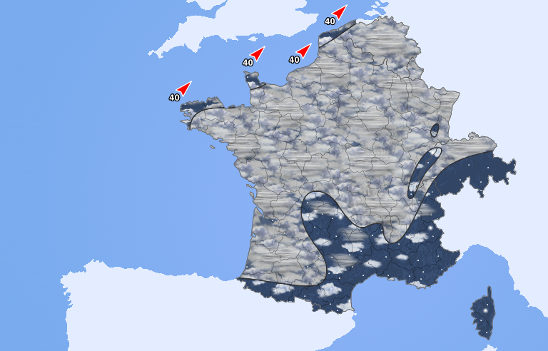 Des pluies circulent sur les Pyrénées frontalières et le sud-est, plus soutenues du golfe du Lion aux Cévennes et de la Corse aux Alpes avec de la neige dans les stations dès 1600-1700 mètres. Au nord-ouest, un faible front donne quelques pluies de la Loire-Atlantique au Pas-de-Calais. Entre les deux, on retrouve davantage d'éclaircies entre le midi-toulousain et la Belgique. Notons le vent soutenu entre Corse et continent. Les températures restent très douces pour la saison, particulièrement dans les régions du sud et du centre.