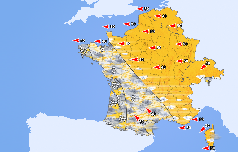 Le temps alterne entre nuages et belles éclaircies. C'est à l'est que le soleil est le plus franc, en dehors d'un risque d'averses entre les Alpes et le Jura. En revanche, les nuages sont plus menaçants sur les régions bordant la Manche et l'Atlantique, jusqu'en Belgique, avec le possible déclenchement d'averses et d'orages. Ils peuvent être ponctuellement forts en fin de journée, notamment sur l'Aquitaine et les Charentes. Le vent de sud à sud-est souffle du domaine de l'autan jusqu'au Lyonnais. Les températures restent très douces voire modérément chaudes avec un ressenti parfois lourd en après-midi.