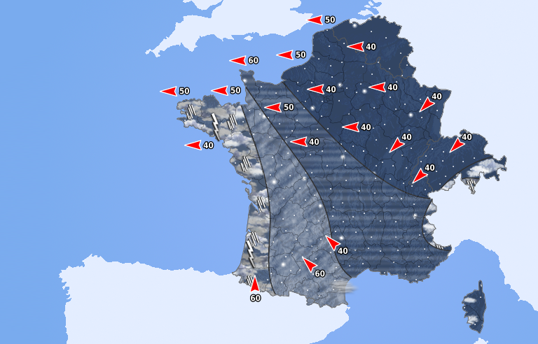 Le temps est calme avec un ciel étoilé ou simplement voilé sur de nombreuses régions. Les nuages sont plus nombreux à l'ouest avec des averses localement orageuses pouvant concerner les départements atlantiques. Le vent continental souffle sur les régions du nord.