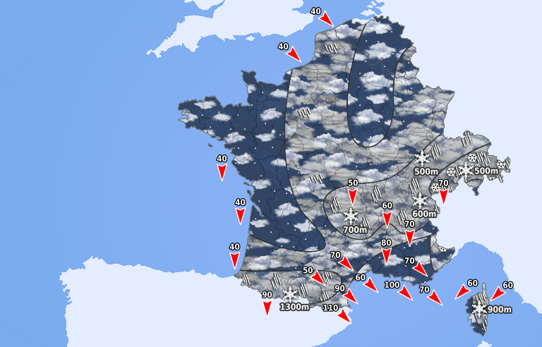 Le ciel reste très encombré avec la possibilité de quelques ondées désorganisées. Elles sont plus fréquentes sur les Alpes suisses et les Pyrénées où il neige en montagne. Le mistral et la tramontane continuent de souffler très fortement.