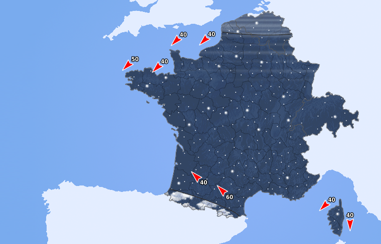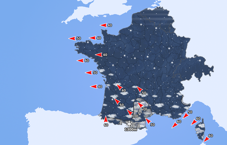 Le ciel est nuageux en Occitanie avec des averses concernant le sud du Massif Central et l'est des Pyrénées. Ce risque concerne aussi le sud des Alpes frontalières et la Corse. Ailleurs, le temps est calme et étoilé avec un vent continental soutenu sur toute la moitié nord.