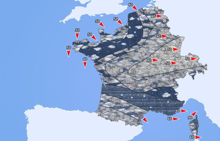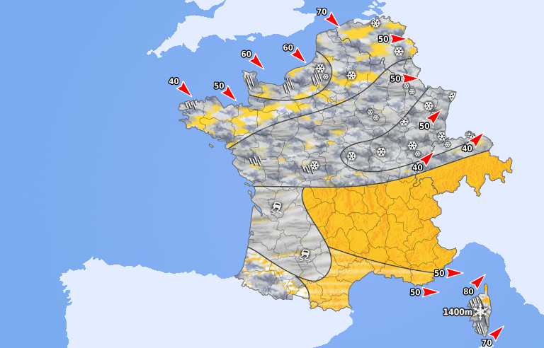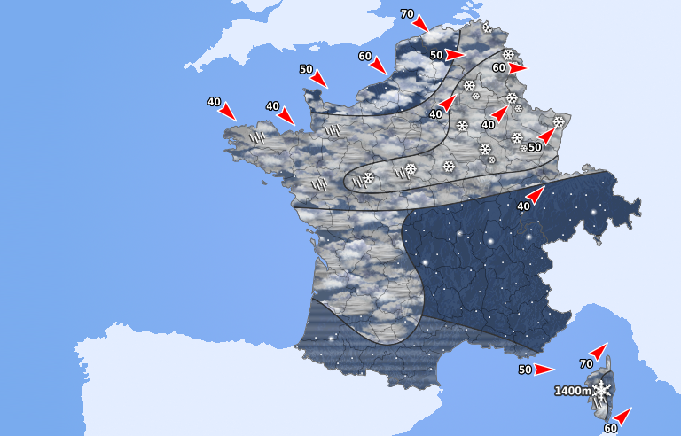 Un front atténué s'enfoncerait sur le nord avec quelques gouttes dans sa partie ouest et flocons dans sa partie est. Au sud, un temps plus ensoleillé dominerait malgré un risque d'ondées toujours présent sur la Corse. Les températures devraient rester bien froides et hivernales.