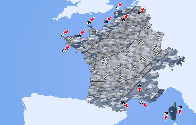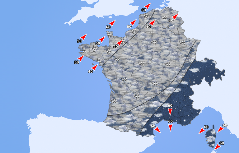 La grisaille domine sur le nord, le centre et l'ouest avec quelques pluies à la clé, surtout de la Vendée à la Belgique et vers la Manche. Dans le midi et jusqu'en Suisse, le temps est sec et souvent étoilé. Le mistral et la tramontane atteignent encore 60 km/h en rafales, tout comme le vent de nord-est sur la Corse.