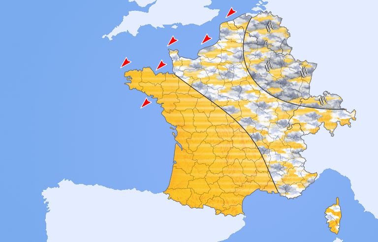 Le ciel est partagé entre nuages et éclaircies avec quelques ondées encore possibles vers les frontières du nord-est et la Suisse. Le ciel est souvent dégagé des Pyrénées aux Alpes et au bassin méditerranéen. Mistral et tramontane sont encore soutenus.