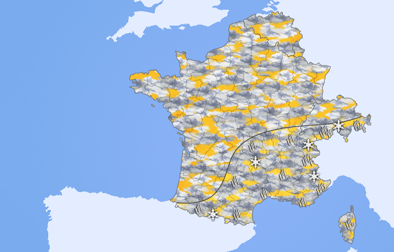 Un petit front pluvieux s'enfonce sur le nord-ouest de la France avec des pluies un peu plus actives vers le Pas-de-Calais où le vent est soutenu. Du sud-ouest à la Lorraine, le ciel est souvent étoilé tandis que des nuages perdurent vers les Alpes et la Suisse avec encore quelques flocons en montagne.